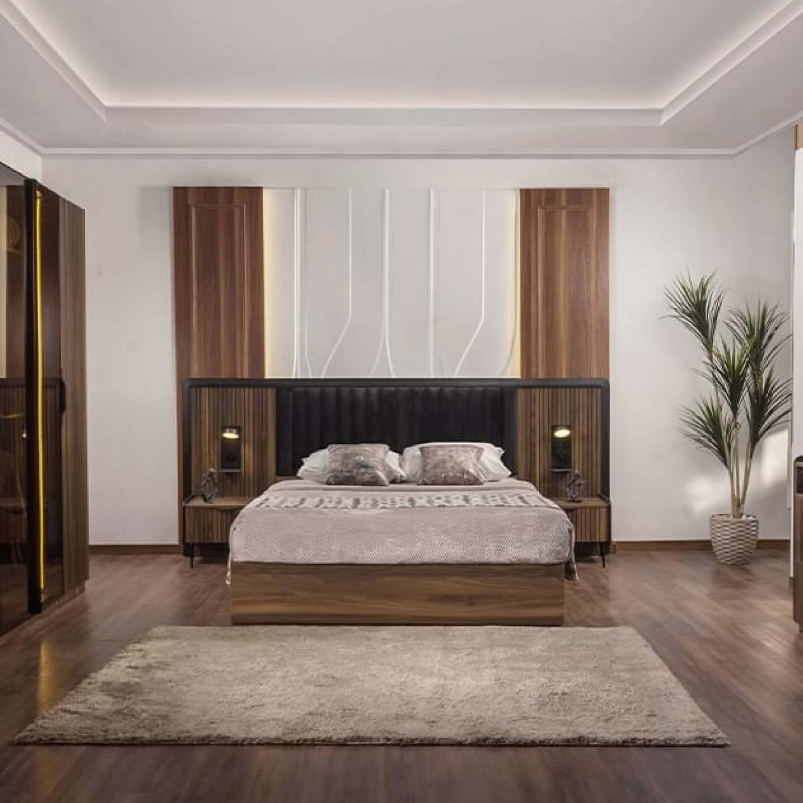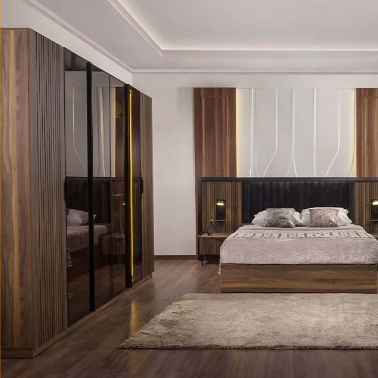 غرفة نوم مكونة من سرير + ٢ كمود + تسريحة + دولاب خشب ام دي اف