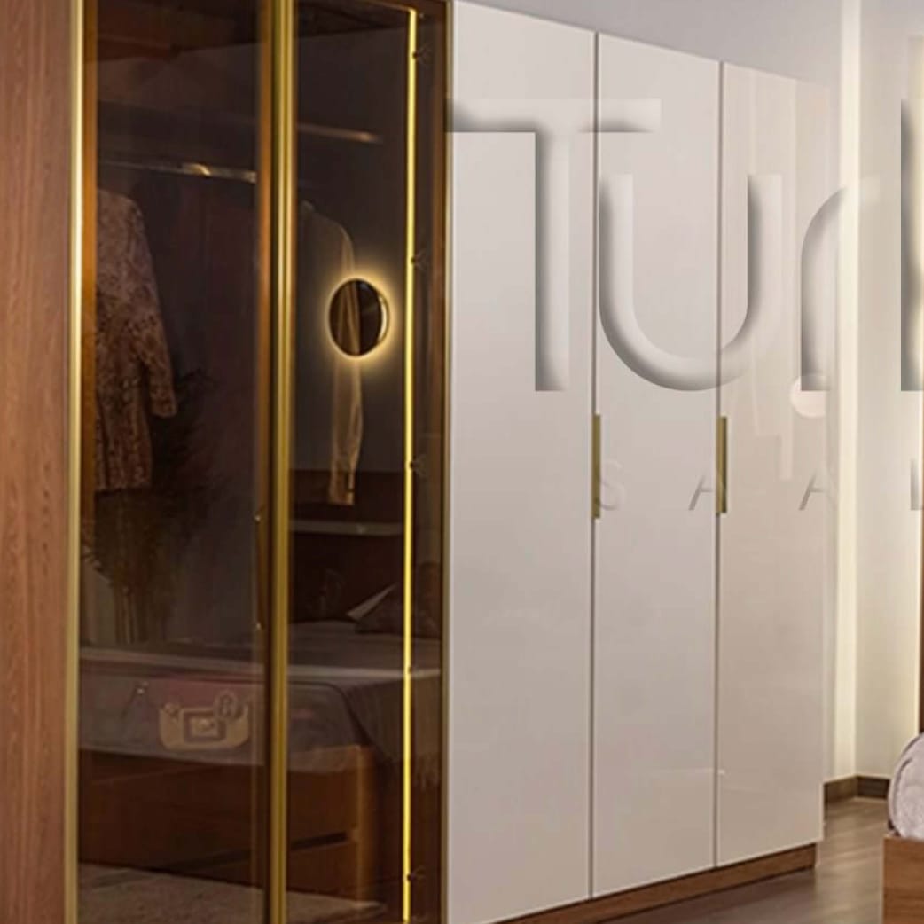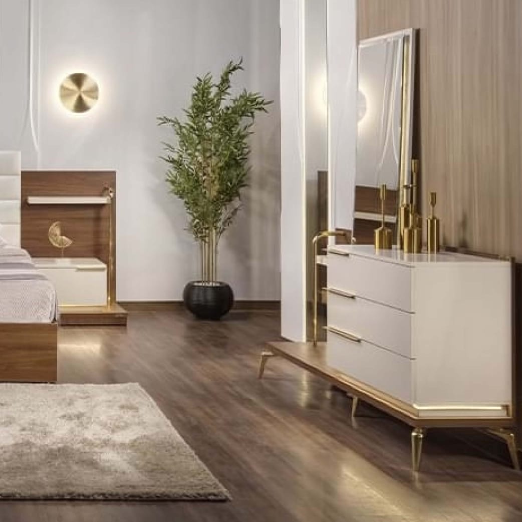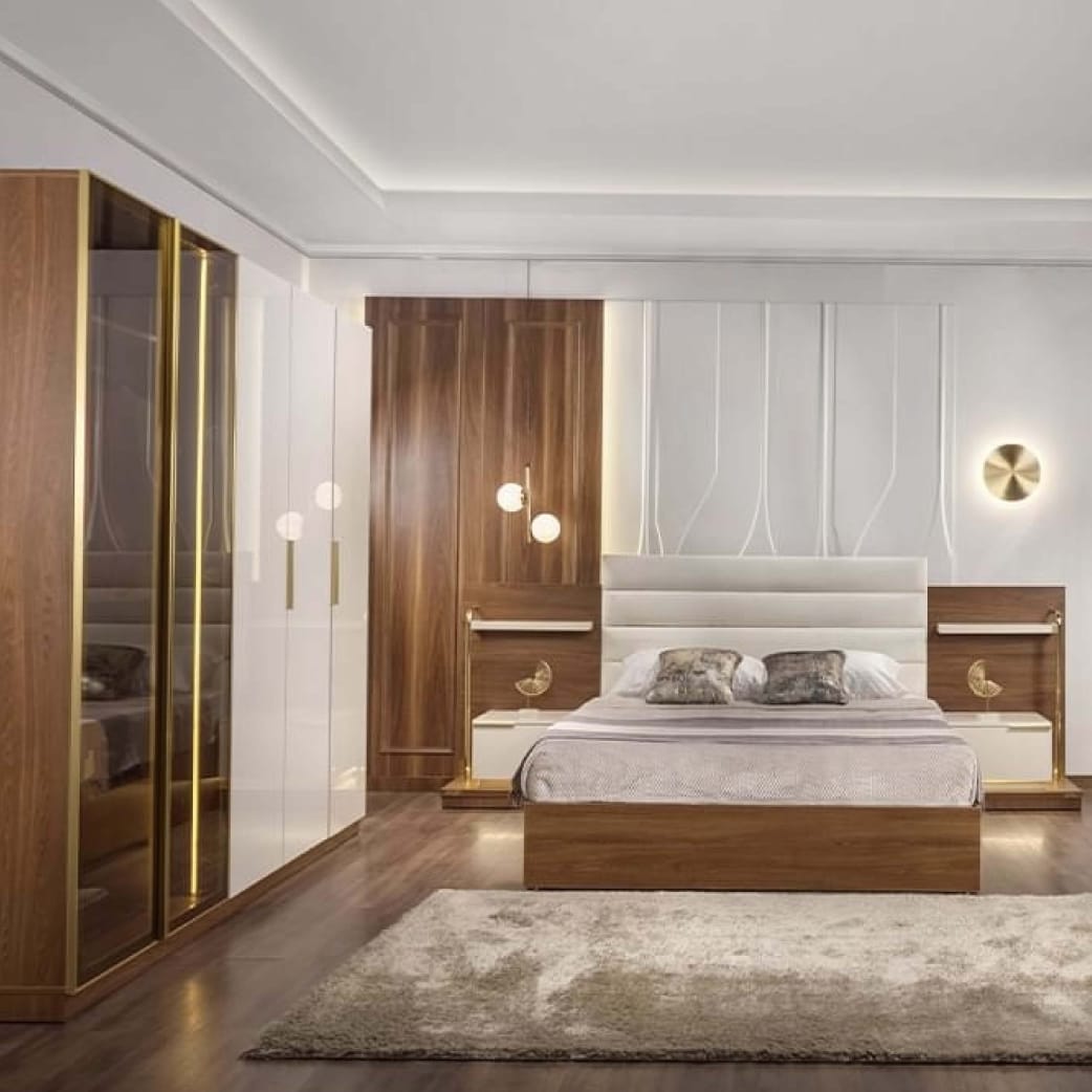 غرفة نوم مكونة من سرير + ٢ كمود + تسريحة + دولاب خشب ام دي اف