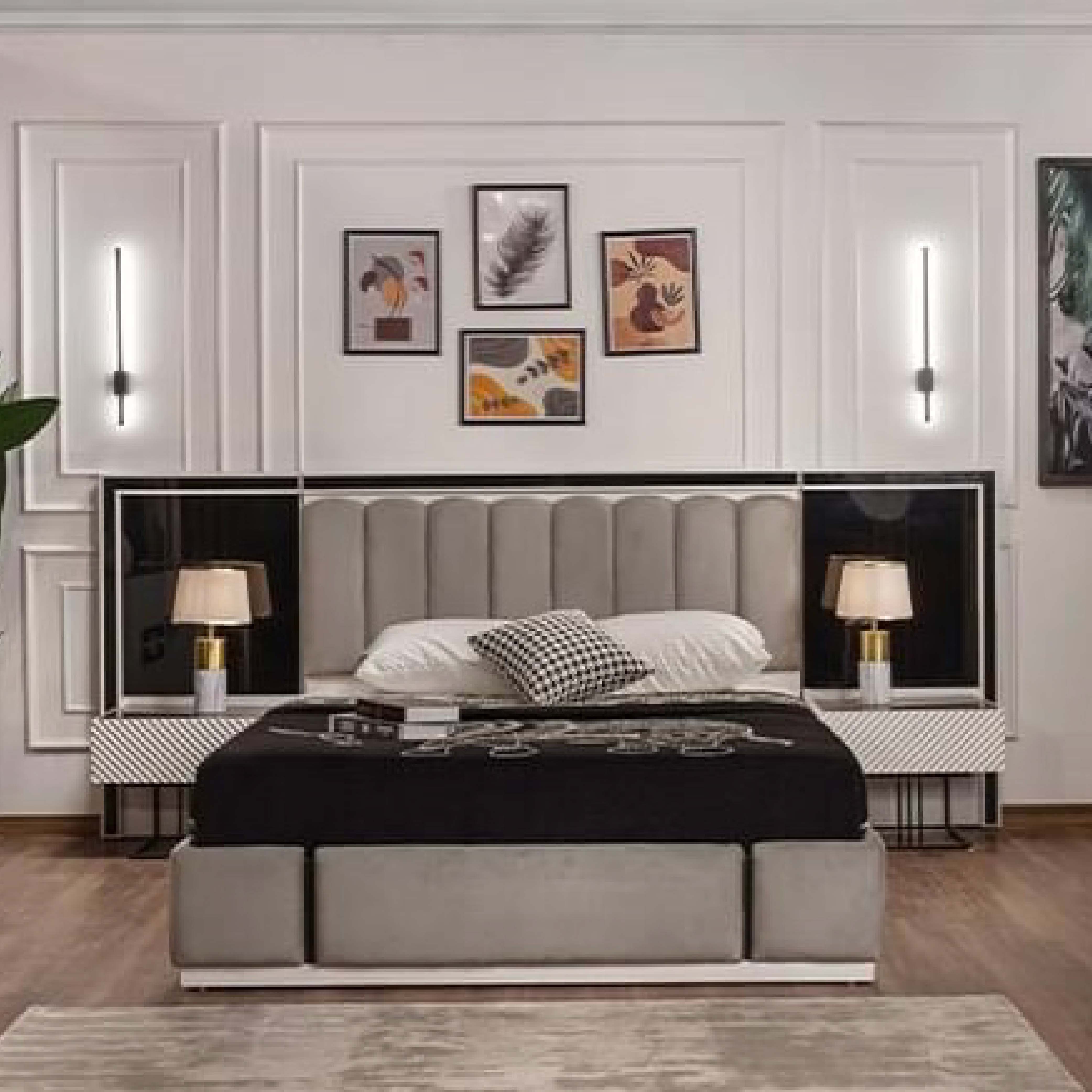 غرفة نوم مكونة من سرير + ٢ كمود + تسريحة + دولاب خشب ام دي اف