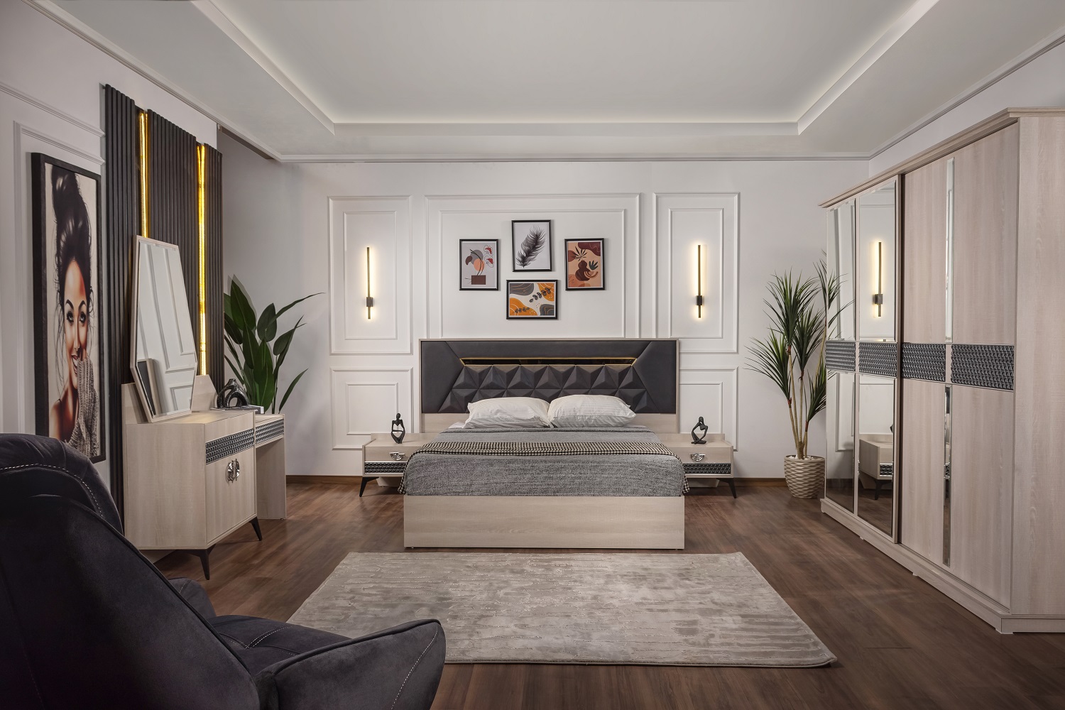 Wardrobe + bed + 2 chests of drawers + dressing table with mirror + pouf + bench + hanger